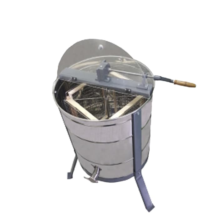Медогонка Techtron ручная на 4 рамки. Сделана в Сербии. Высота центрифуги: 1100 мм. Диаметр бочки: 610 мм. Изготовлена из нержавеющей стали AISI 304. Корзина окрашена пищевой эмалью. Система редуктора FERLAUF означает непрерывное вращение корзины, даже если редуктор не вращается. Ножки центрифуги легко собирать и разбирать.