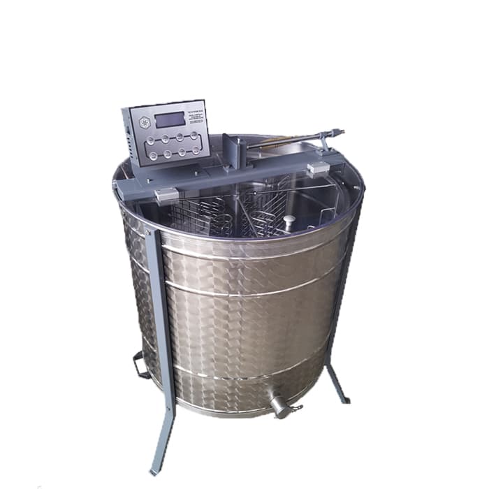 Медогонка Techtron на 4 рамки. Сделана в Сербии. Высота центрифуги: 1300 мм. Диаметр бочки: 650 мм. Изготовлена из антимагнитной нержавеющей стали INOX 304. Центрифуга управляется программно-цифровой автоматикой с которой работает мотор на 250 Вт. Мощность на 12 или 220 В. Скорость и время работы автоматики устанавливаются пользователем. Автоматика имеет встроенную память, которая фиксирует 4 режима работы.